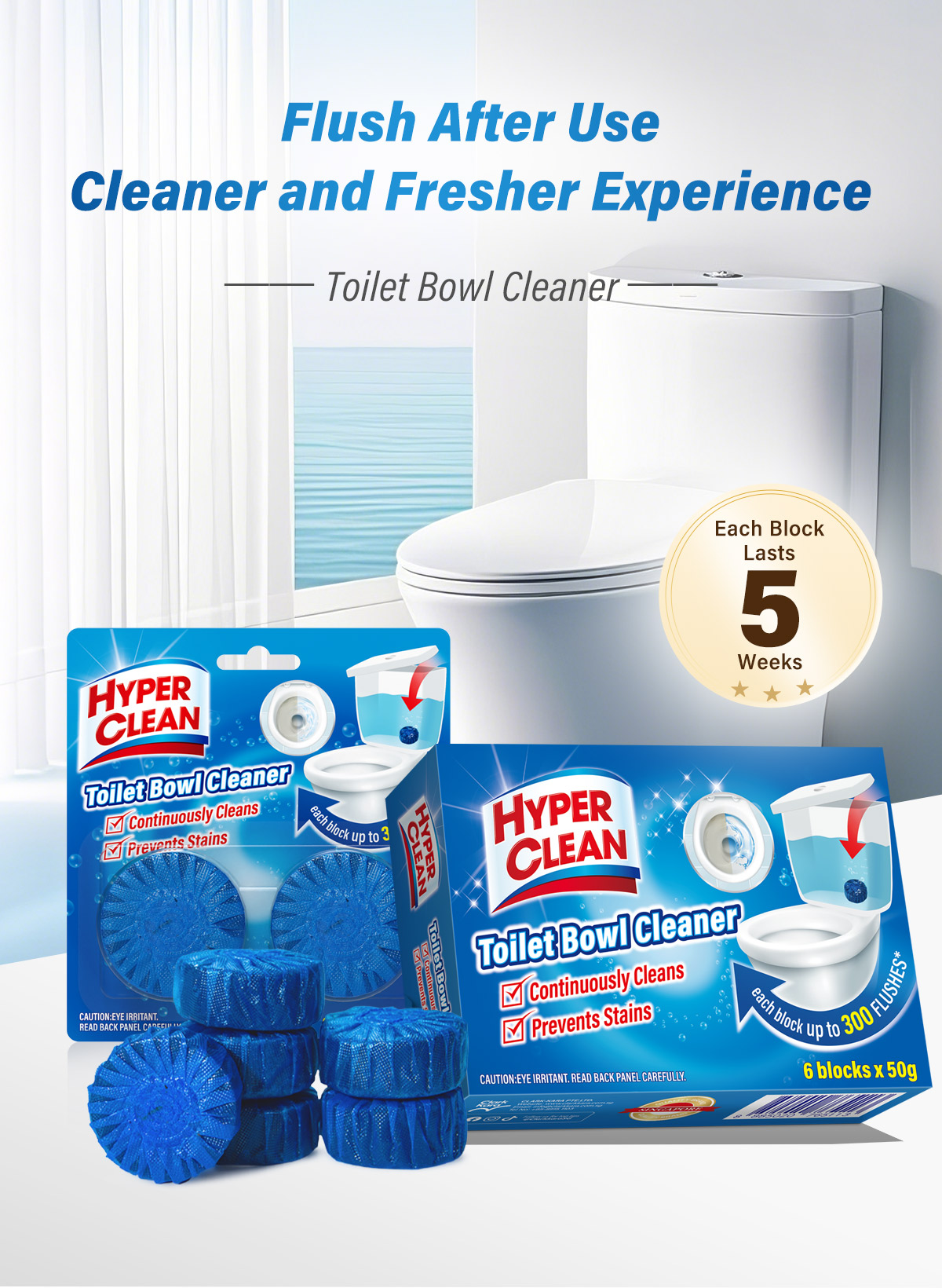 Keep your toilet sparkling clean with HYPERCLEAN Toilet Blocks. Just place in the cistern and let it do the job – tandas kekal bersih & wangi automatically.